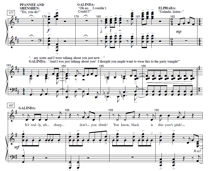 Eventually, we get the melody from “What is this feeling?” but with the lyrics of “Out of the goodness of my heart” – which has the same kind of deceptive playfulness that belies Glinda’s true intentions in the same way she was “loathing” Elphaba in the original song.